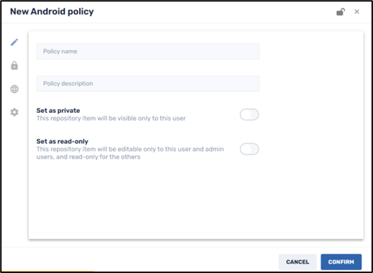 When you click on the Android icon to create a new Android policy, the following screen appears: