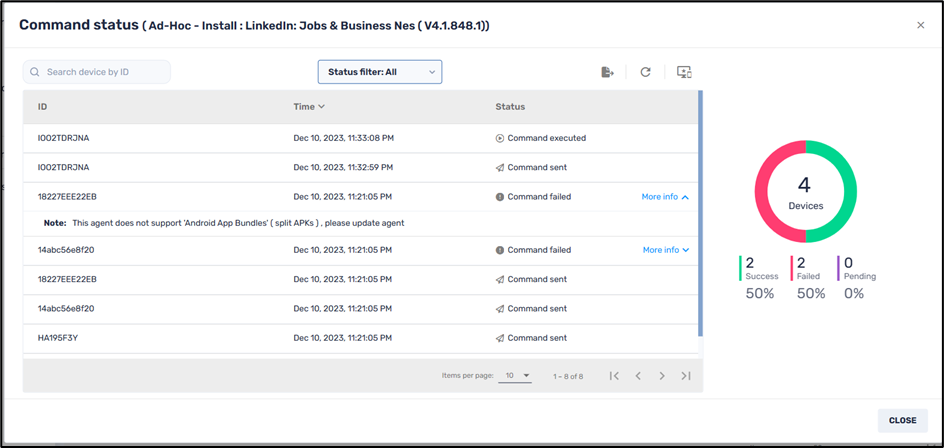 In the example below, the Radix MDM successfully delivered the command to install the LinkedIn app on 2 out of 4 devices. Clicking on the More Info option of a failed command in the Commands History Console displays the reason why the command failed to execute. In this case, the reason was that the particular device does not support Android App Bundles.