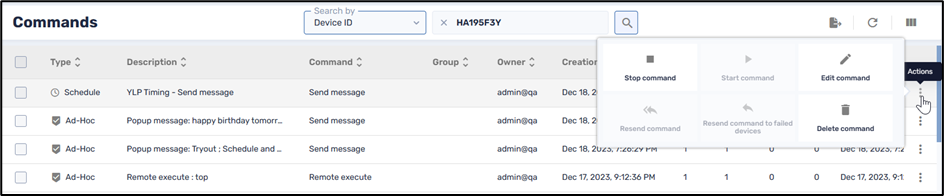 Clicking on the three-dots menu on the far right of the command entry will give you more command options. The options include stopping, starting, editing, resending, or deleting a command.