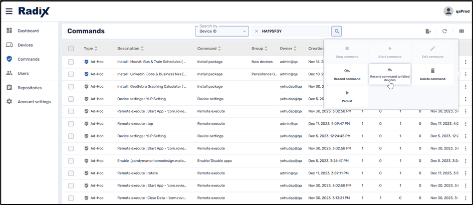 The Radix MDM includes a Commands History Console, which allows you to inspect the results of the commands you send to the remote devices. You can inspect commands sent to individual devices, or groups of devices, to see if everything went smoothly. You can view the status of individual commands, or series of triggered commands. Also, you may want to manage the ongoing commands sent to your devices. The Radix MDM Commands History Console will help you do this.