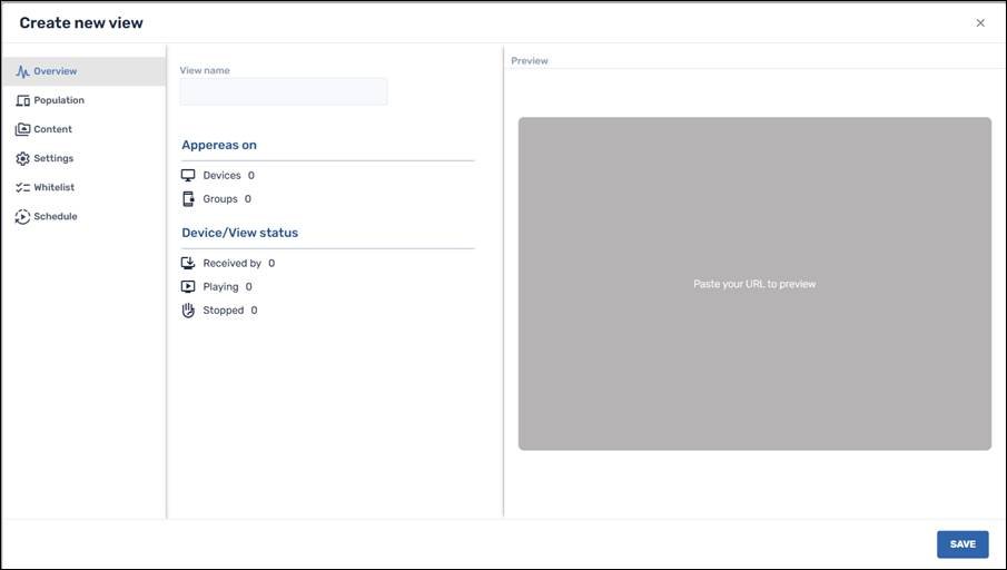 When you click on Create new in the Views console, the Overview tab appears in the Create new view window. The Overview screen displays the statistics about which devices are showing a particular view.