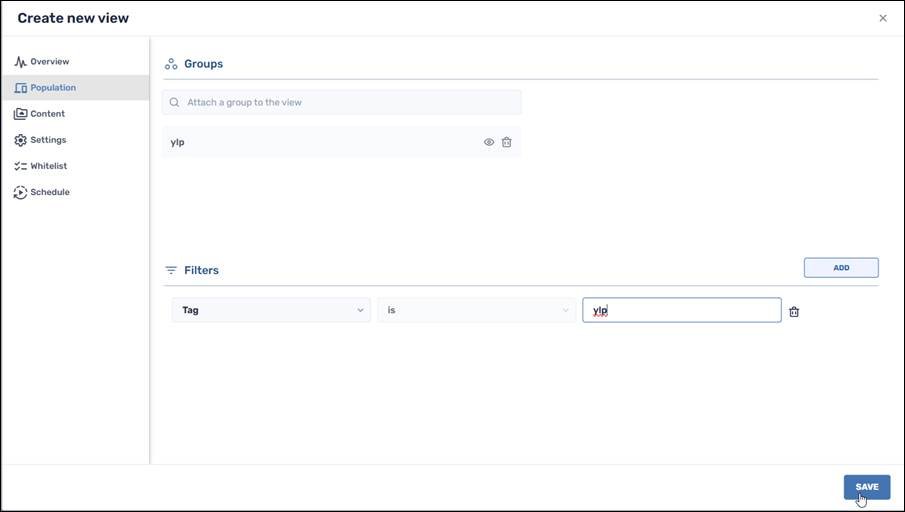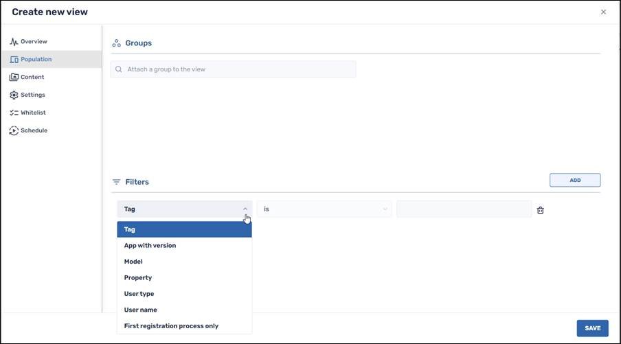 1. Click on the Population tab in the sidebar menu. Here, you will associate the view with a group of devices. You can also add a filter to apply the View to only specific devices within a group.