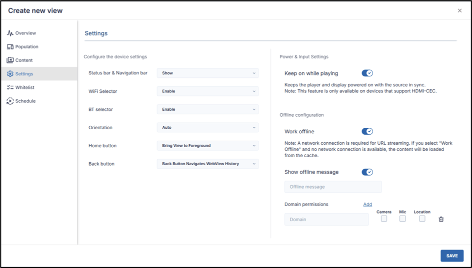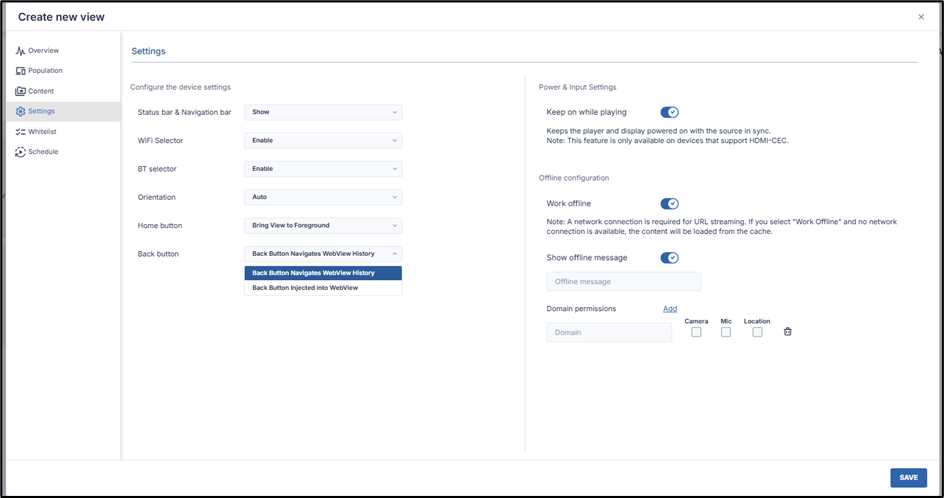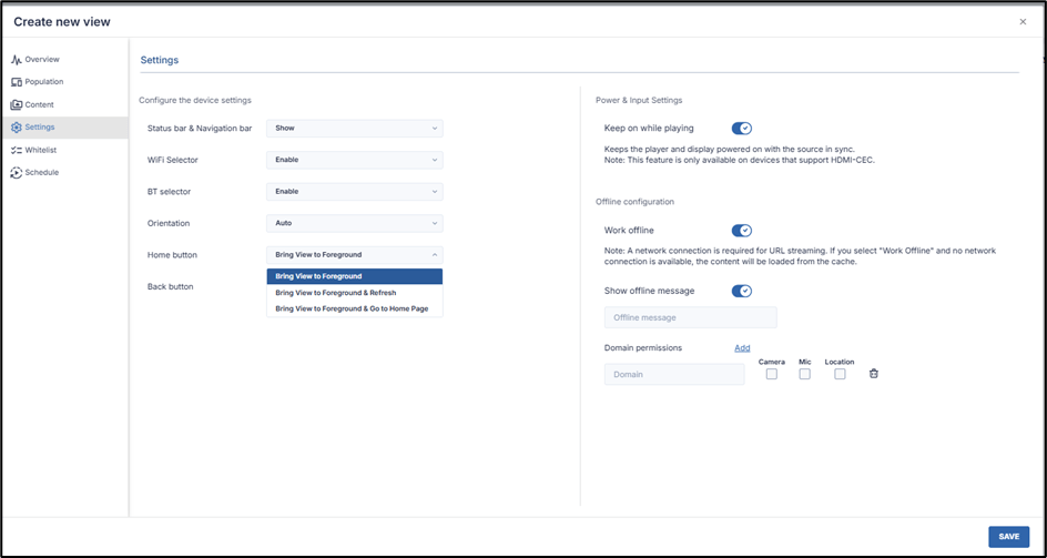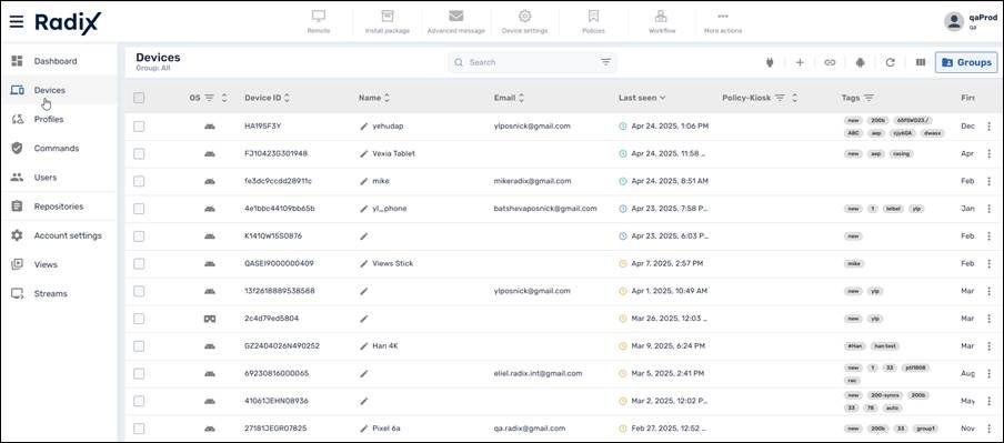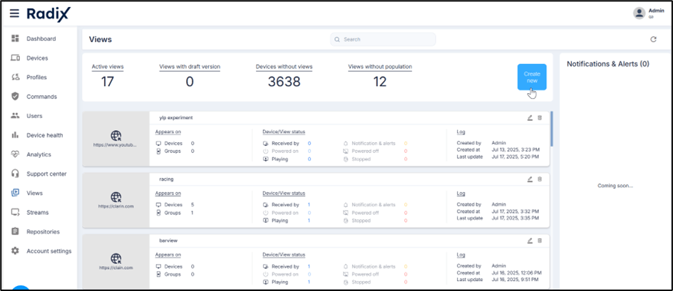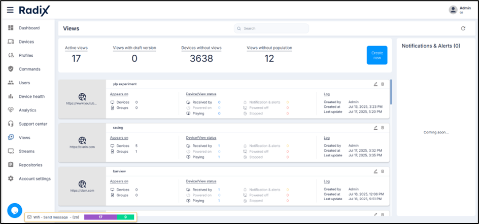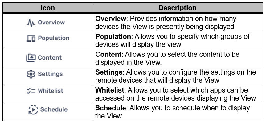 The Radix Device Management platform features the Views Console, which allows you to create a setup for a remote device so that it can be used as a specialized kiosk display. Whereas the Kiosk option limits a device to certain websites and applications, creating a View allows the devices in a group to display content from a specific URL that you provide. In addition, you can activate certain apps on the remote devices.