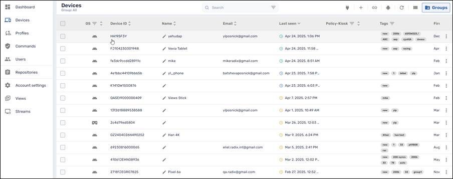 Device Data: Data options can include the device’s Device ID in the Device Dashboard in the Radix MDM.