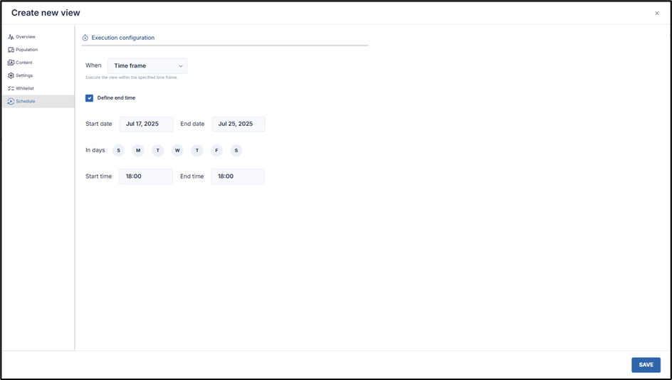 - Over a time frame: To execute the view over a time interval, where you assign the start and end time.