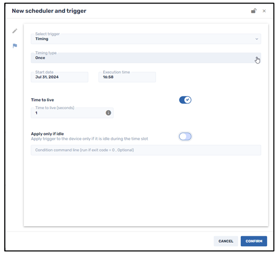 - Time to Live option In case the device is not accessible at the defined time, the Time to Live option is how long the command will be executed, after the assigned time. After that time, the trigger is irrelevant and no longer applies.