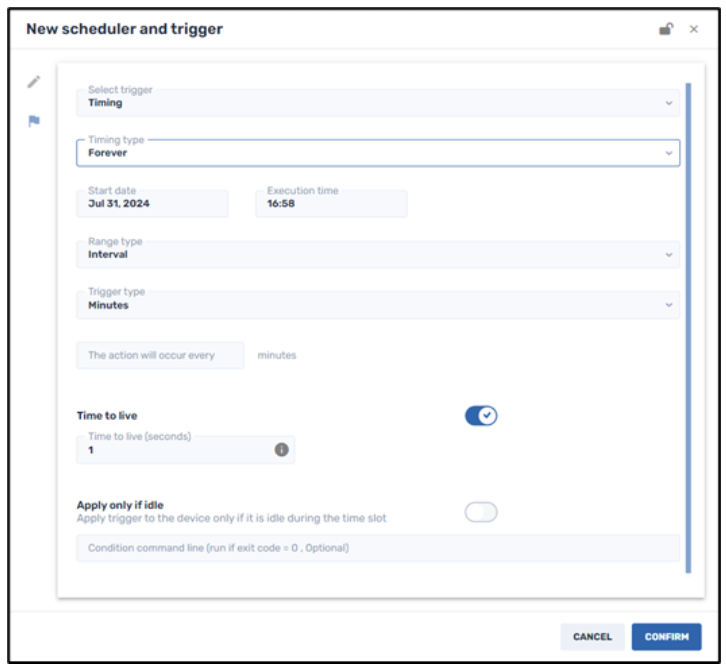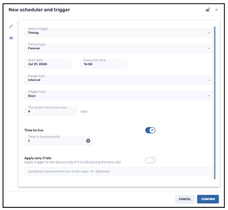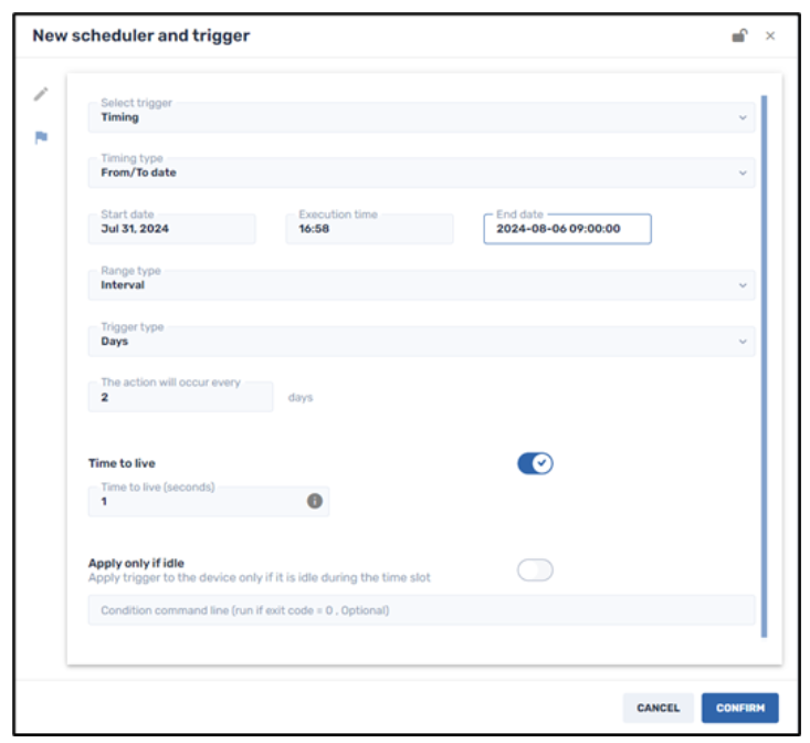 This option allows you to execute a command within a specific range of dates, at a specified time interval, starting from an assigned date. In the above example, the trigger will execute the command from July 31, 2024 to August 6, 2024, at an interval of once every 2 days.