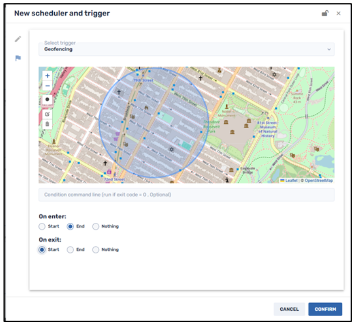 This trigger allows you to execute a command within a certain geographic perimeter. You can draw the perimeter on a map and specify that the command should be executed if the device leaves that perimeter. (The minimum size for an area is a 20-meter radius.)