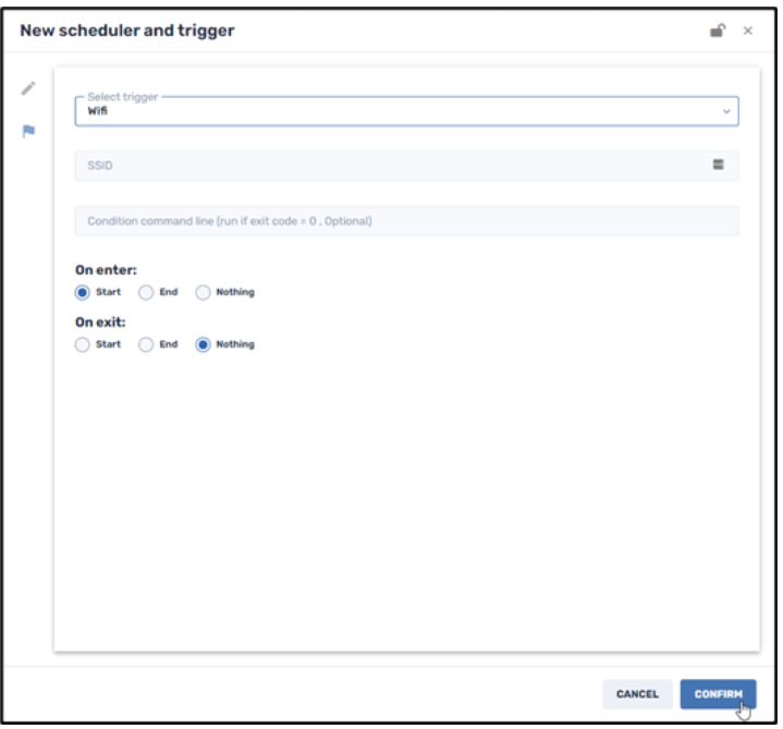 This allows you to execute a command to trigger an event upon receiving a Wi-Fi SSID connection trigger. This can also be used as a security precaution, to shut down or erase a device if it leaves a specific Wi-Fi SSID.