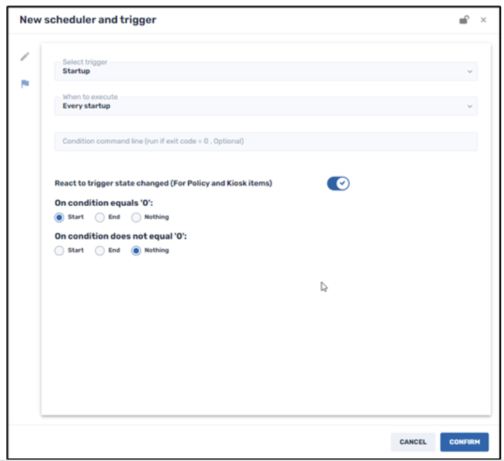 If you choose to employ the Startup Trigger, you can either execute a command 1) at every startup or 2) only the first time when a device is registered in the Radix Device Manager.