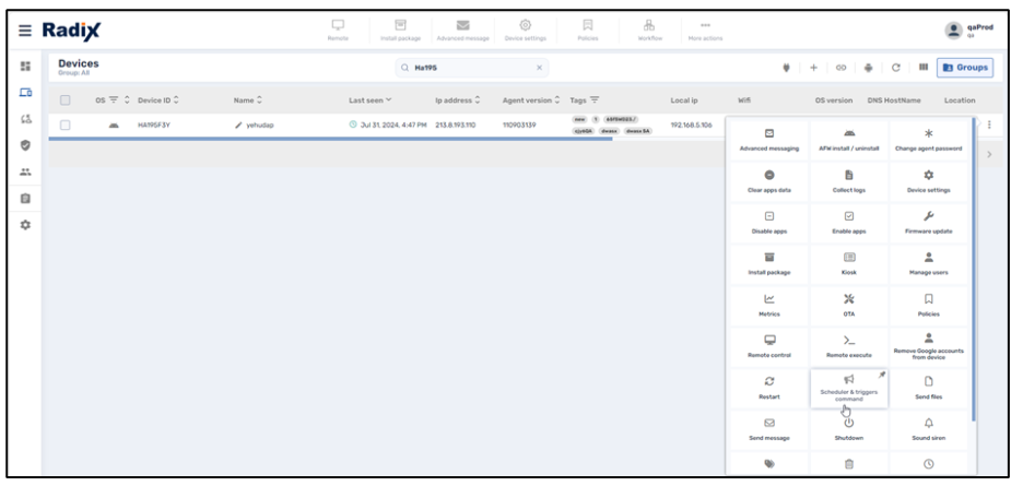 - Click on the device’s kebab menu and select the Schedule & Trigger Command tile.