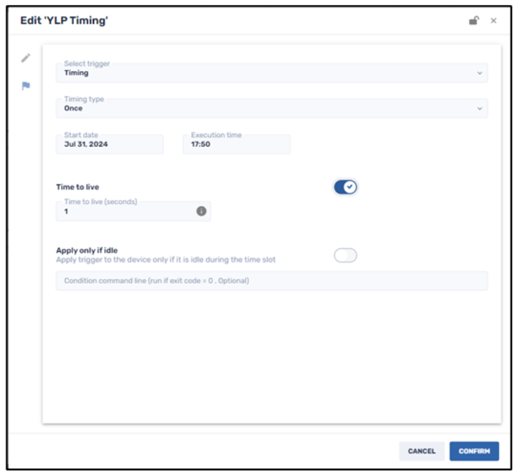 - Select the desired trigger, to set the command into action. For example, we’ll use YLP Timing. We have set it to trigger the command for a single day: July 31, 2024, at 17:50: