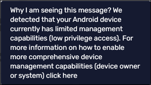 The device administrator will receive a similar message from the Device Console, which manages the deployment of this device, when clicking on the warning icon: