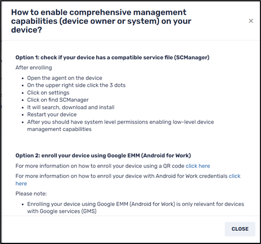 If you click on the warning icon, a window opens, giving you options to enable comprehensive management capabilities on the device and reset the device’s authentication token.