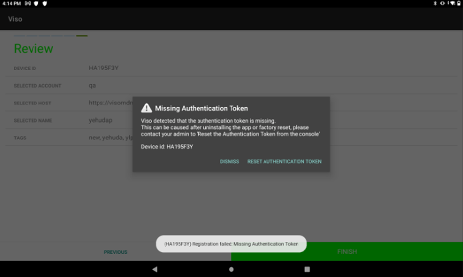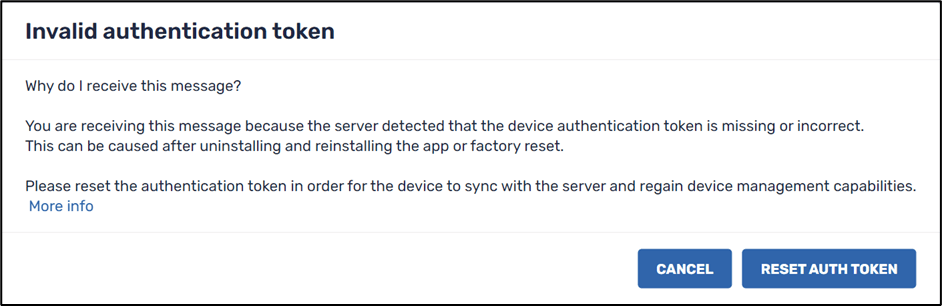 This indicates that the device has lost its authentication token and cannot register with the server. It could be due to the uninstalling and reinstalling the Radix app on the device, a factory reset, or performing a data wipe on the device. The warning message text box provides the following explanation: