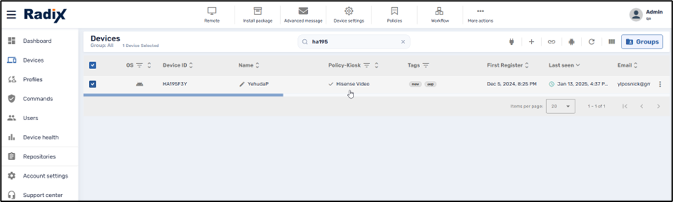 3. After applying a View option to a device, there will be an indication in the Device Console that the device is presently in “View” mode. In the example below, we see that the Hisense Video view option has been applied to the device HA195F3Y.