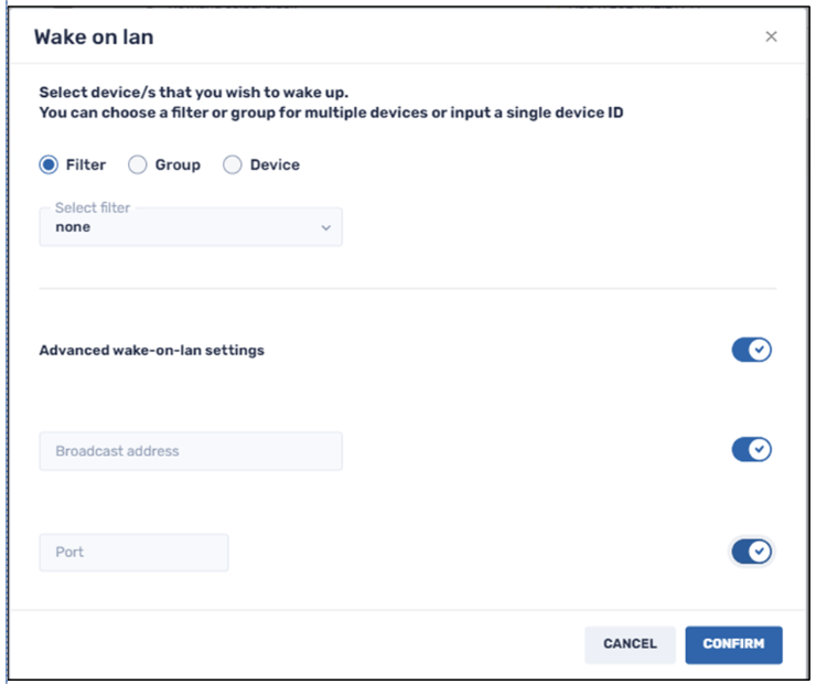 • Filter: This allows you to select one of the saved search filters, to narrow down the set of devices to wake up.