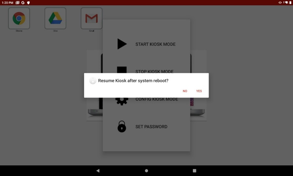 - Select “Yes” if you want the device to revert to Kiosk mode after you reboot it.