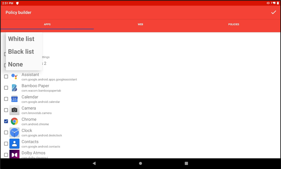 Apps whitelist/blacklist: This allows you to select from apps already installed on the device, whether they should be allowed or blocked.