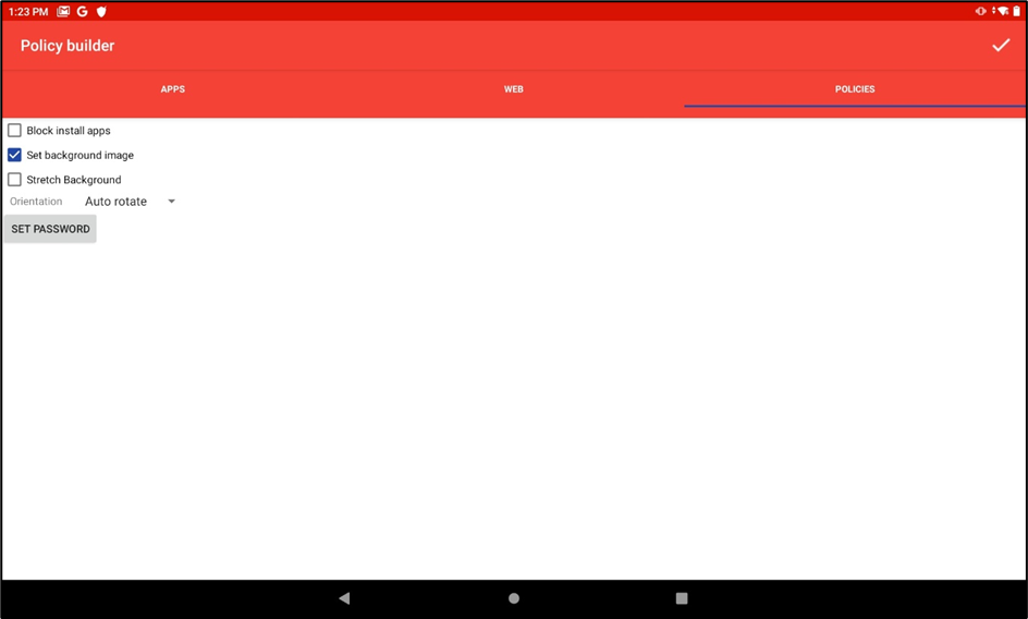 Policies: This allows you the user to block or unblock the ability to install apps on the remote device, set the background image and its orientation, and set a policy password.