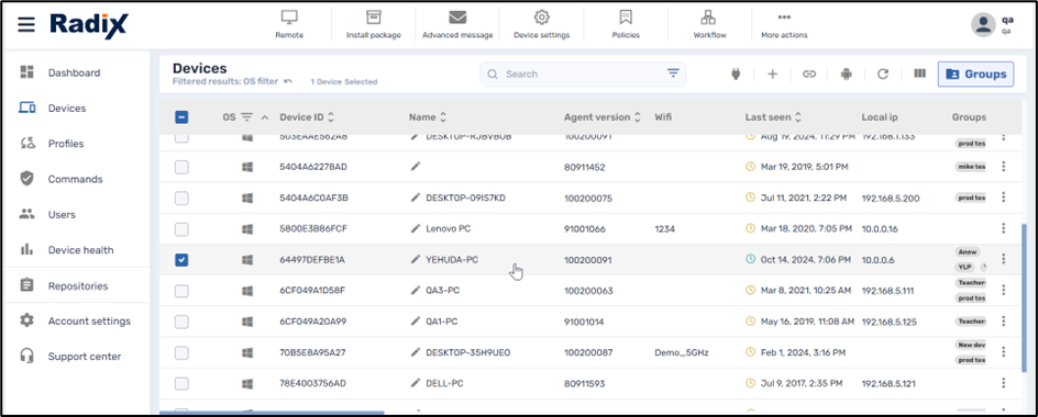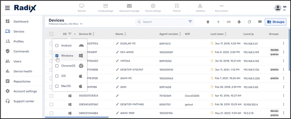 2. Since you can only apply Smart Recovery to Windows devices, you may want to filter out the devices in the list by their operating system. Click on the Filter icon in the OS column to display only Windows devices.