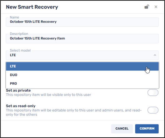 3. Select the LITE model of the Smart Recovery application from the drop-down list.